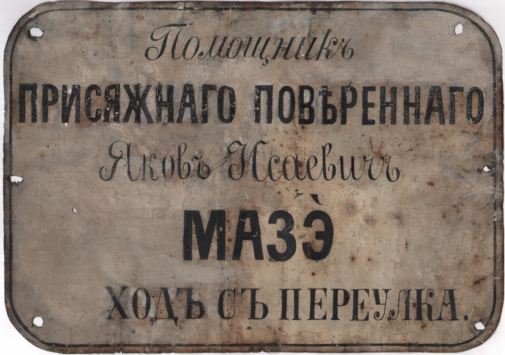 Табличка с надписью “Помощник присяжного поверенного Яков Исаевич Мазэ” – не только биографическая деталь из жизни известного человека, но важное свидетельство жизни общины за пределами Черты оседлости. Яков Мазэ родился в Могилёве, в религиозной семье, связанной как с любавичскими хасидами, так и с их противниками. Такая среда обеспечила мальчику еврейское образование на очень высоком уровне, но во второй половине XIX века для многих юношей этого было уже недостаточно.