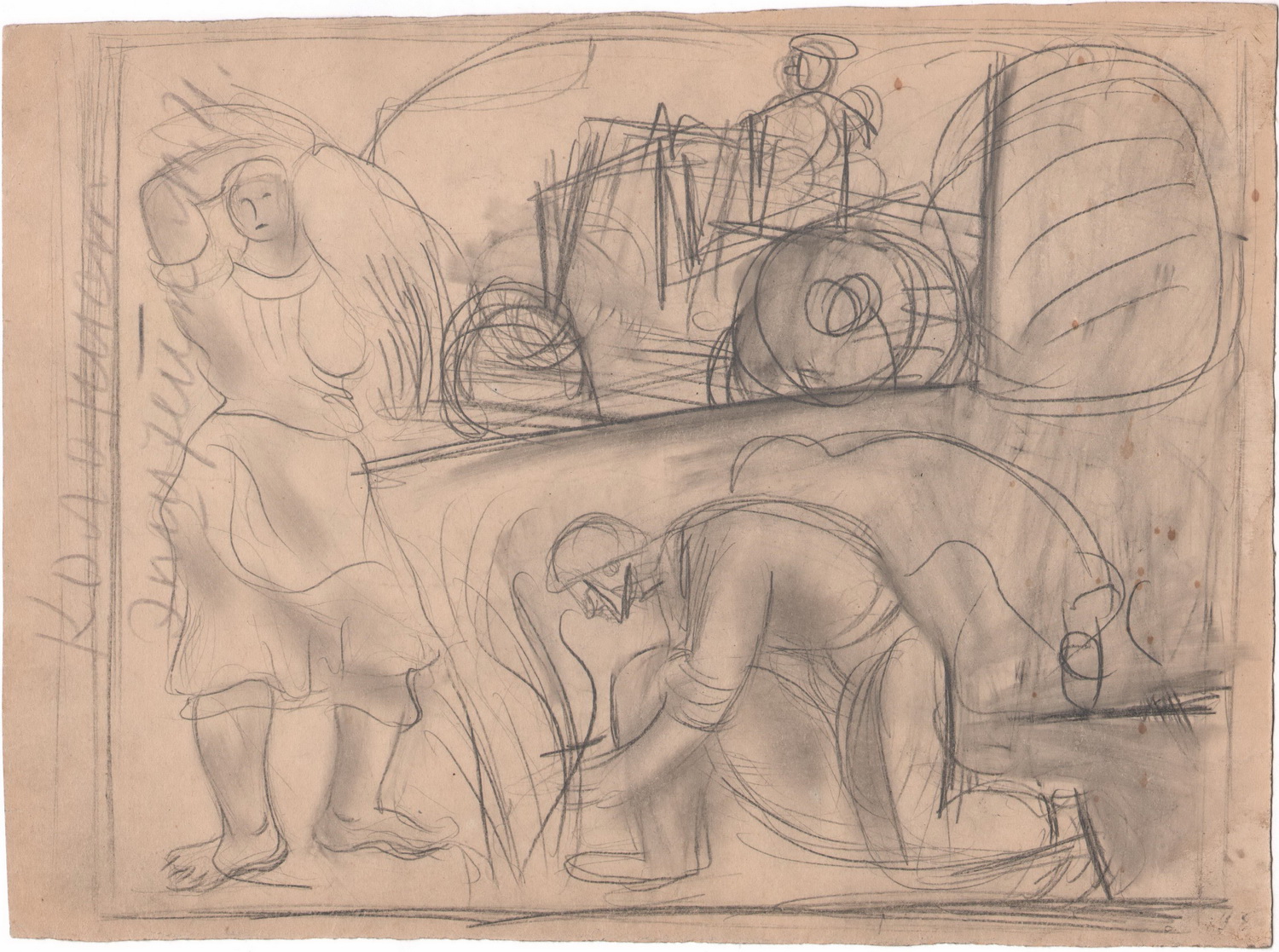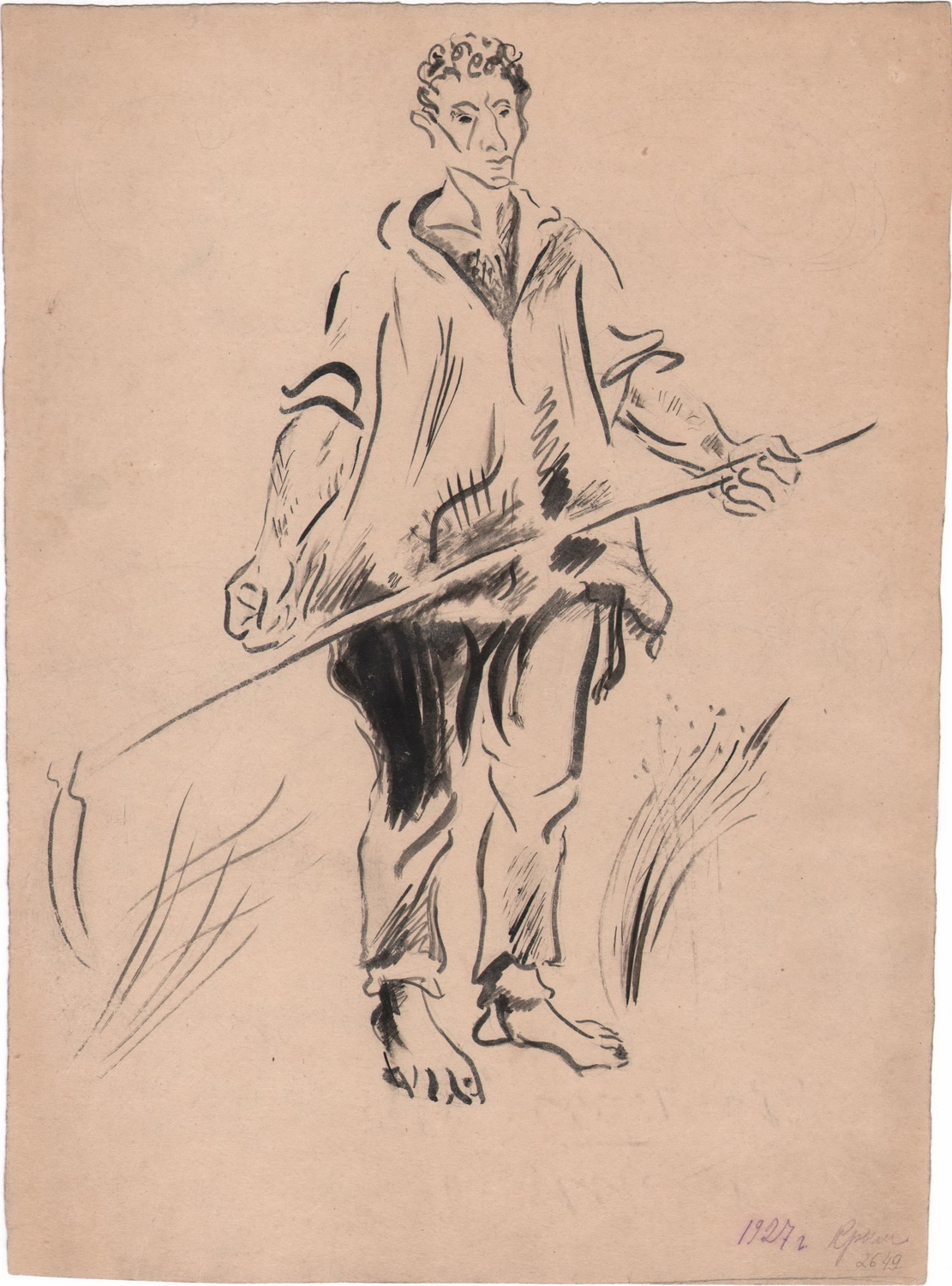 One of the ink drawings made by Epstein during his trip to Crimea now resides in the collection of the Museum of Jewish History in Russia. In the center of the sheet is the figure of a standing colonist holding a scythe. The visual treatment is extremely laconic and cursory, but at the same time a feeling of volume and a monumental sense of form predominates in the sketch. The massive torso, bare feet and powerful arms serve as accent points of the composition, thereby drawing attention to the metamorphosis of Jewish physicality under new circumstances. Despite the obvious physical strength of this mower, the image does not quite fit into the heroic model common in official art and visual culture: the static pose of the hero, devoid of pathos, rather hints at the fatigue of an inexperienced farmer after a hard day's work.