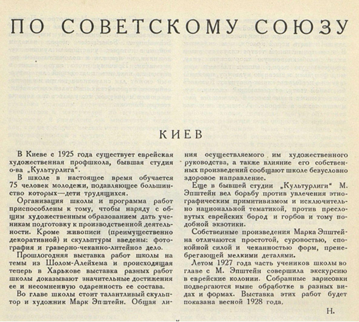 At the beginning of the 20th century, the Russian Empire became the epicenter of the movement aimed at the formation of modern Jewish art. For a short, but fruitful period, the young generation of artists, well versed in the achievements of both Western avant-garde art and Jewish traditional culture, managed to synthesize the lessons of cubism, futurism and expressionism with the plastic qualities of folk ornament, which at that time were discovered by ethnographic expeditions. To a large extent, this project became possible thanks to the efforts of the Kultur-Lige – an organization founded in Kiev in 1918 with the goal of developing Jewish secular culture in Yiddish. Its artistic department determined the contours of the new national style through exhibitions, publishing and educational activities. When at the end of 1920 the Communist Party took control over the Kultur-Lige, many of its members left Kiev and settled in other cities. Among those who decided to stay was Mark Epstein – a sculptor and graphic artist, one of the founders and first teachers at the Kultur-Lige art studio.